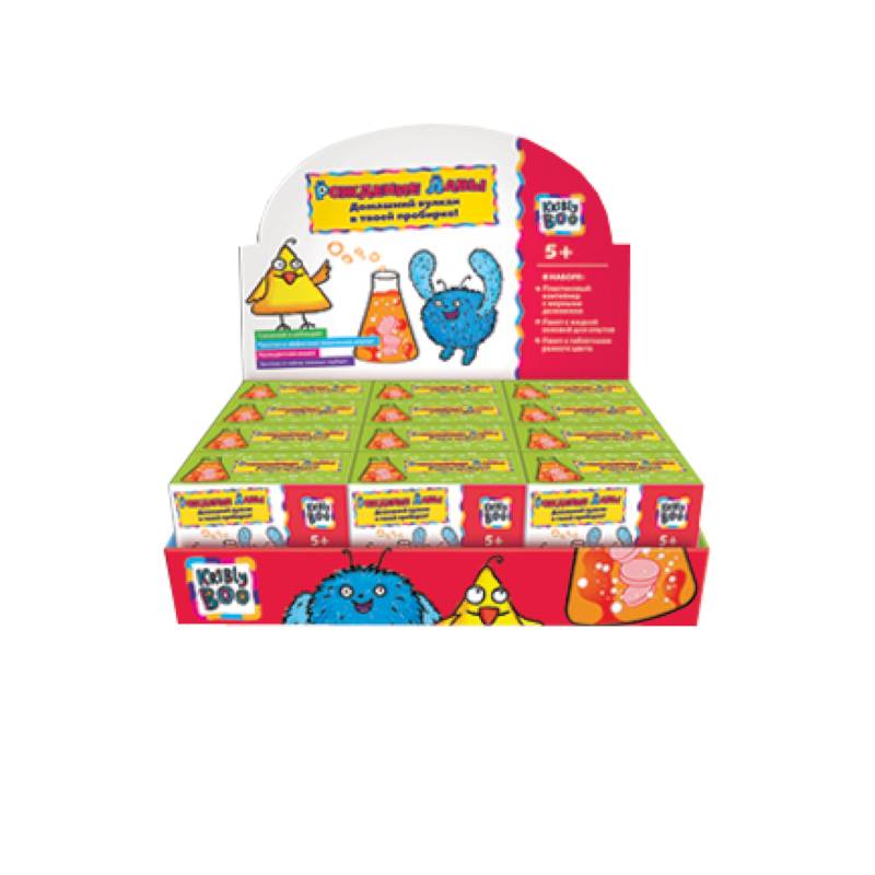 В наборе: пластиковый контейнер с мерными делениями, пакет с жидкой основой для опытов, пакет с таблетками разного цвета.