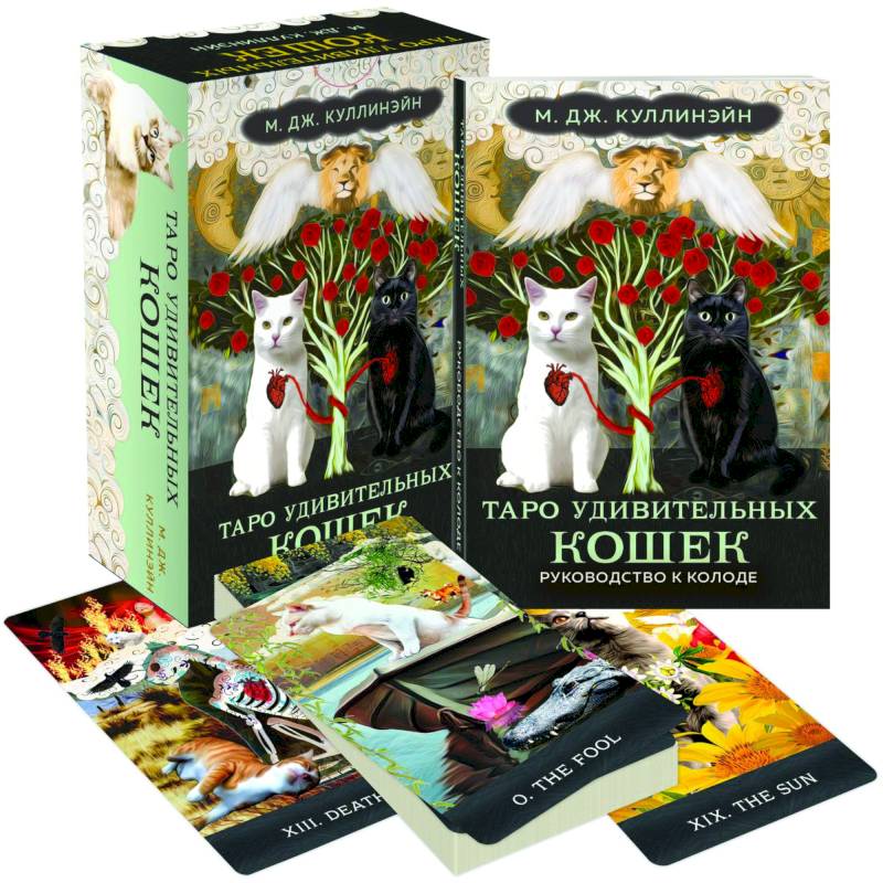 «Таро удивительных кошек» М.Дж. Куллинэйн — 100% кошачья колода. Она рассказывает о самых разных кошках: от бродячих попрошаек до упитанных толстяков, от безволосых сфинксов до пушистых гигантов. На каждой карте этого Таро, созданного в традиции классического Таро Уэйта, хорошие, плохие, грациозные и неуклюжие кошки совершают свое собственное «Путешествие Шута» — и делятся с нами, кожаными двуногими, своими открытиями.