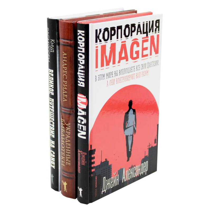 В комплект 'Семейная библиотека' вошли три книги: - Джейн Александер 'Корпорация IMAGEN' - Андрес Ридел 'Украденные библиотеки' - Кнуд Расмуссен 'Великое путешествие на санях. Белый эскимос'