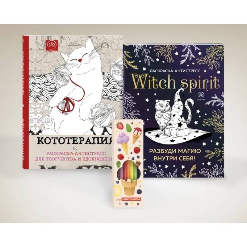 В этом подарочном наборе вы найдете две раскраски ('Witch spirit. Разбуди магию внутри себя! Раскраска-антистресс' и 'Кототерапия. Раскраска-антистресс для творчества и вдохновения') и набор из 24 фломастеров.