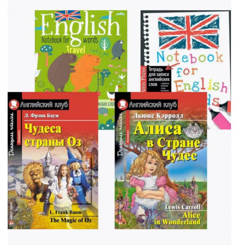 Комплект состоит из двух тетрадей для записи английских слов и двух книг уровня Elementary на английском языке: