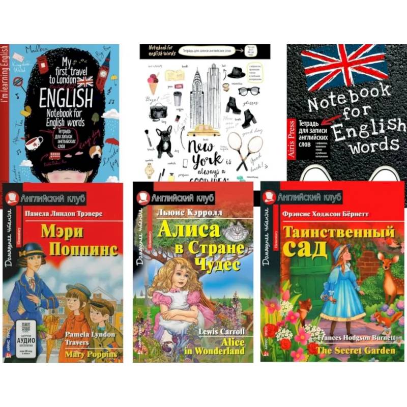 Комплект состоит из трех тетрадей для записи английских слов и трех книг уровня Elementary на английском языке: