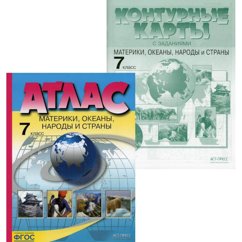 Атлас с комплектом контурных карт, который можно использовать в качестве учебного пособия по географии 7 класса.