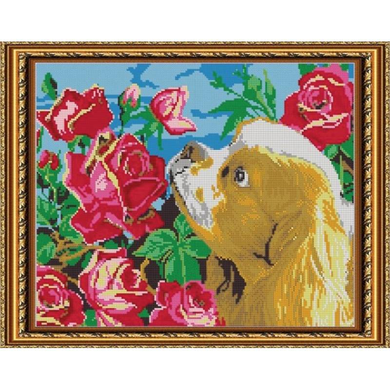 'Щенок в алых розах' 38x30см набор на атласе для вышивания чешским бисером 'Вышивочка'
